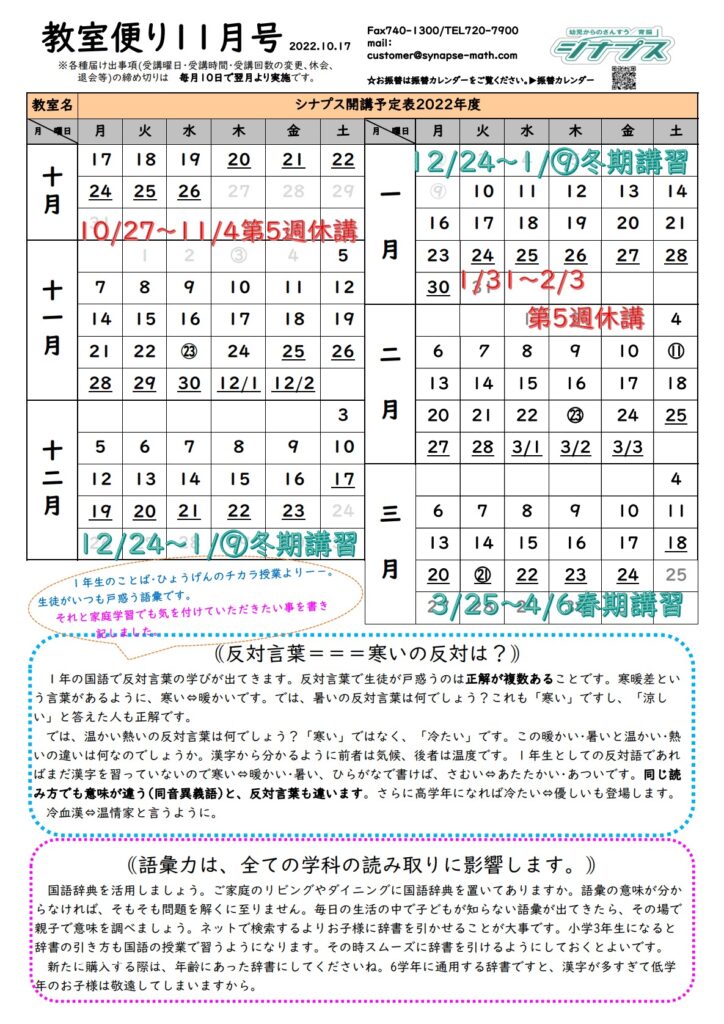 教室便り11月号を拡大して見る、PDFダウンロードはこちらをタップ